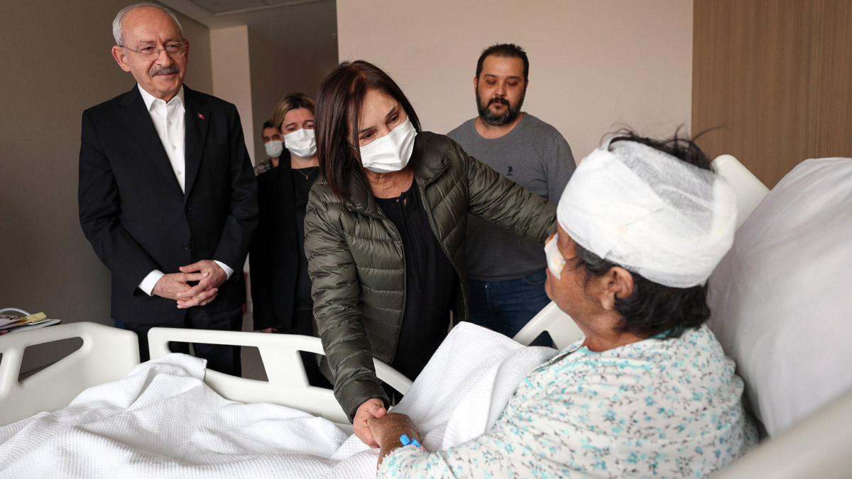 CHP Genel Başkanı Kılıçdaroğlu, eşi Selvi Kılıçdaroğlu ile depremde yaralanarak Bilkent Şehir Hastanesi’nde tedavi altına alınan depremzedelere ziyarette bulundu. Ziyarette CHP Genel Sekreteri Selin Sayek Böke de yer aldı. Kılıçdaroğlu, depremzedelere ‘geçmiş olsun’ dileğinde bulunurken, sağlık durumlarıyla ilgili de doktorlardan bilgi aldı.