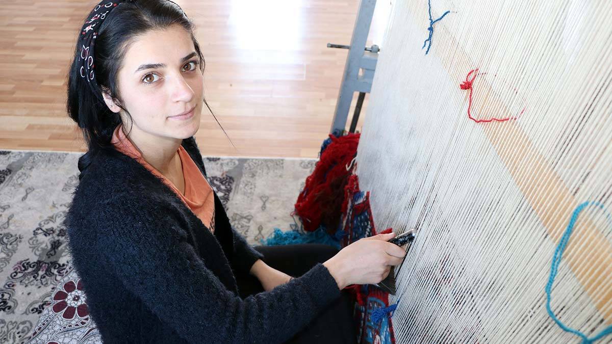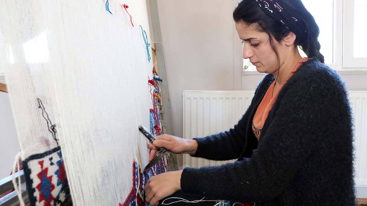 Van’da Şehrivan Köklü (19), ailesine yük olmadan hayali olan hemşirelik bölümüne girmek için Büyükşehir Belediyesi’nin açtığı kilim dokumacılığı kursuna katıldı. Aile bütçelerine katkı sağlamak isteyen kadınlarla unutulmaya yüz tutan kilimleri dokuyan ve aylık 1800 lira kazanan lise mezunu Köklü, “Kilim dokumacılığından aldığım para ile aileme yük olmadan kendime üniversiteye hazırlık kitapları alıyorum. Hem kilim dokumayı öğreniyorum hem de üniversiteye hazırlanıyorum. Okulu giden 2 kardeşlerime de destek oluyorum” dedi.