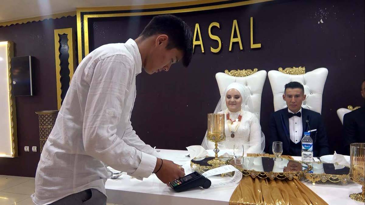 Kırgız Türklerinin düğününde pos cihazı ile takı
