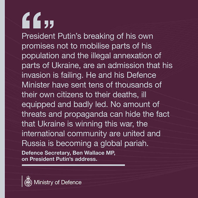 İngiltere Savunma Bakanı Ben Wallace Putin’in kısmi seferberlik ilan etmesinin ardından yaptığı açıklamada kısmi seferberlik ilanını ‘işgalin başarısızlığının itirafı’ olarak nitelendirdi. Wallace şu ifadeleri kullandı: