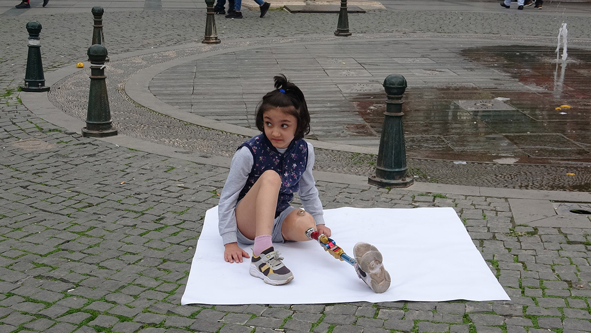 Ali İhsan Yıldırım, kent merkezinde insan yoğunluğunun olduğu Attalos Meydanı’nda eylem yaptı. Kızı için 8 yıldır hukuk savaşı verdiğini söyleyen Yıldırım, yanında getirdiği kızının protez bacağının üzerine motorlu testereyi bıraktı.