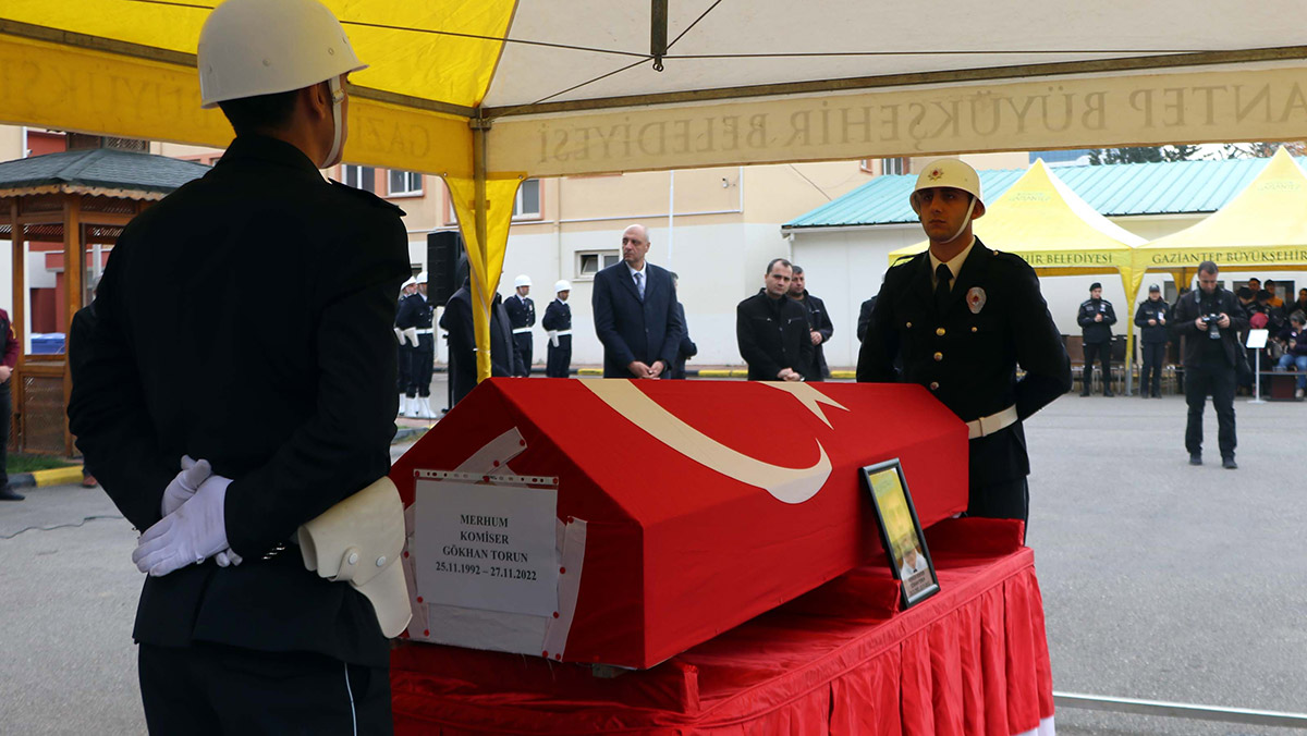 Gökhan Torun için sabah saatlerinde İl Emniyet Müdürlüğü Çevik Kuvvet Şube Müdürlüğü’nde tören düzenlendi. Törene; Gaziantep Valisi Davut Gül, 5’inci Zırhlı Tugay Komutanı Tuğgeneral Hacı Halil Osma, Büyükşehir Belediye Başkanı Fatma Şahin, İl Emniyet Müdürü Mustafa Emre Başbuğ, İl Jandarma Komutanı Tuğgeneral Hidayet Arıkan ile komiserin annesi Hatice Torun ile silah arkadaşları katıldı.