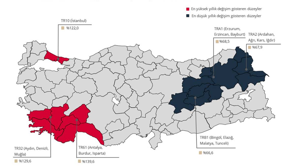 Üç büyük il için konut fiyat endeksi değişimine bakıldığında ise martta bir önceki aya göre İstanbul’da 9,8, Ankara’da 9,6 ve İzmir’de 10,6 artış görüldü. Endeks değerleri geçen yılın aynı ayına göre ise İstanbul’da yüzde 122, Ankara’da yüzde 111,7 ve İzmir’de yüzde 105,9 yükseldi.