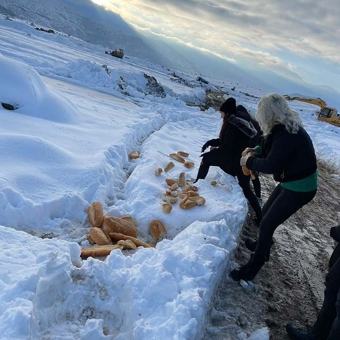 Dernek Başkanı Ayla Sayar, ”Bu soğuk ve karlı havada hayvanlar yiyecek bulmakta güçlük çekiyor. Bizde gönüllü genç üyelerimizle birlikte fırından kendi imkanlarımızla 500 ekmek alıp sokak hayvanlarının aç kalkamaması için farklı noktalara bıraktık” dedi.