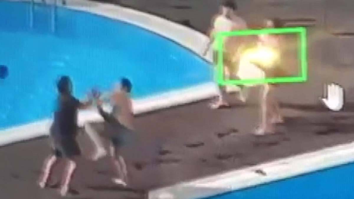 Köpeğin tekmelenmesi ve yöneticinin havuza atılması sitenin güvenlik kamerasına yansıdı.