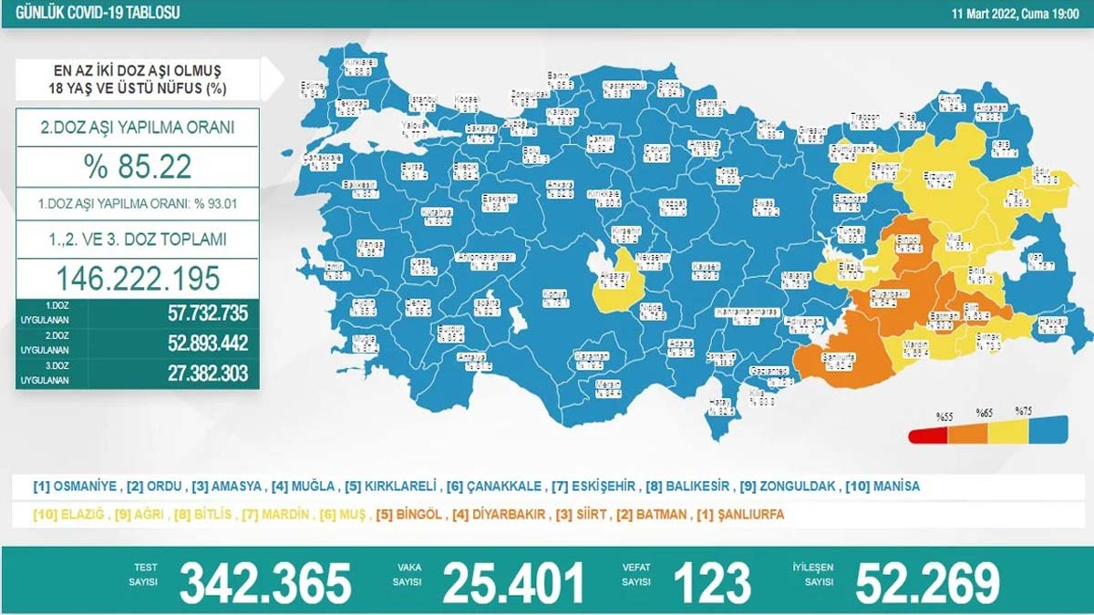 Sağlık Bakanlığı, ‘Koronavirüs tablosu 11 Mart 2022’ verilerini açıkladı. Koronavirüs tablosuna göre; 25 bin 401 kişinin PCR testi pozitif çıktı, 123 kişi hayatını kaybetti.