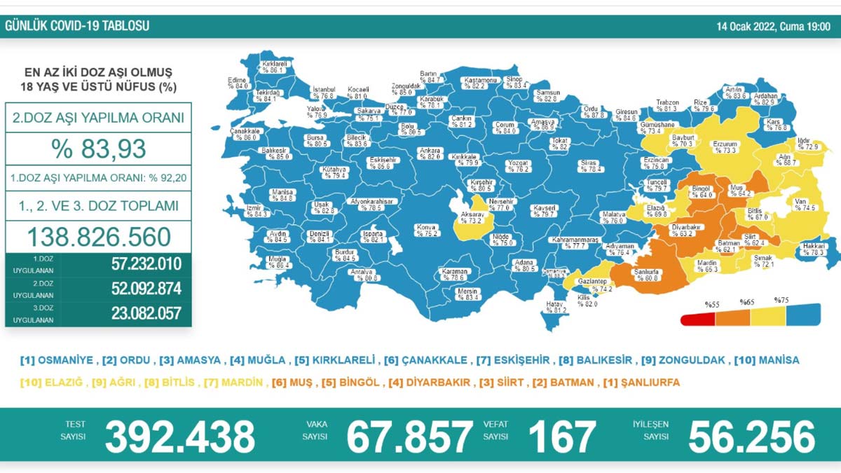 Sağlık Bakanlığı‘nın açıkladığı ‘Günlük Kovid- 19 Tablosu‘ verilerine göre; son 24 saatte yapılan 392 bin 438 testte 67 bin 857 vaka tespit edildi. Koronavirüs nedeniyle 167 kişi hayatını kaybederken, 56 bin 256 kişinin de tedavisi ve karantinası sona erdi.