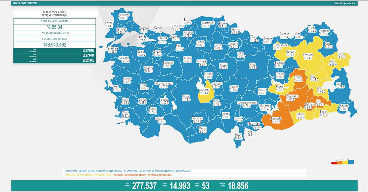 Sağlık Bakanlığı’nın açıkladığı ‘Günlük Kovid- 19 Tablosu‘ verilerine göre; Son 24 saatte yapılan 277 bin 537 testte 14 bin 993 vaka tespit edildi. 53 kişi hayatını kaybederken, 18 bin 856 kişinin de tedavisi ve karantinası sona erdi. 18 yaş ve üzeri nüfusun aşılanması verilerinde 1’inci doz Türkiye ortalaması yüzde 93,09, 2’nci doz ortalaması yüzde 85,34 olarak ölçüldü.