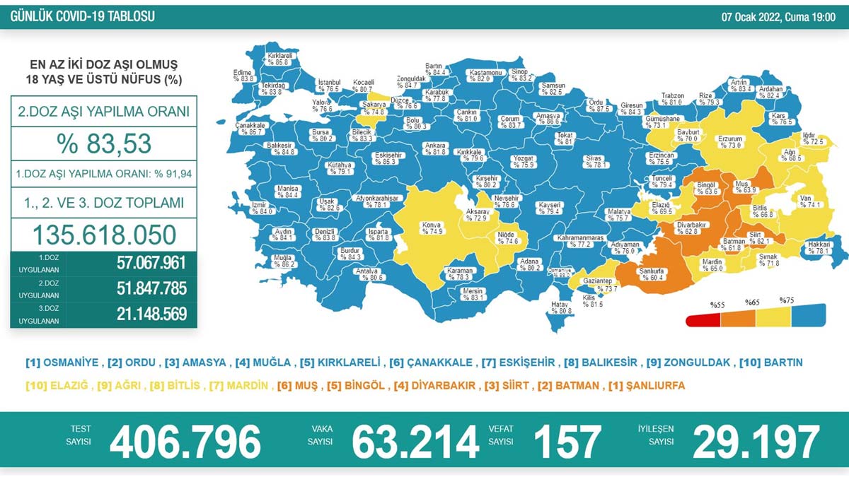 En az 2 doz aşı olan kişi sayısının en yüksek olduğu iller; Osmaniye, Ordu, Amasya, Muğla, Kırklareli, Çanakkale, Eskişehir, Balıkesir, Zonguldak ve Bartın olurken, 2 doz aşı yapılan kişi sayısının en az olduğu iller ise Şanlıurfa, Batman, Siirt, Diyarbakır, Bingöl, Muş, Mardin, Bitlis, Ağrı ve Elazığ oldu.