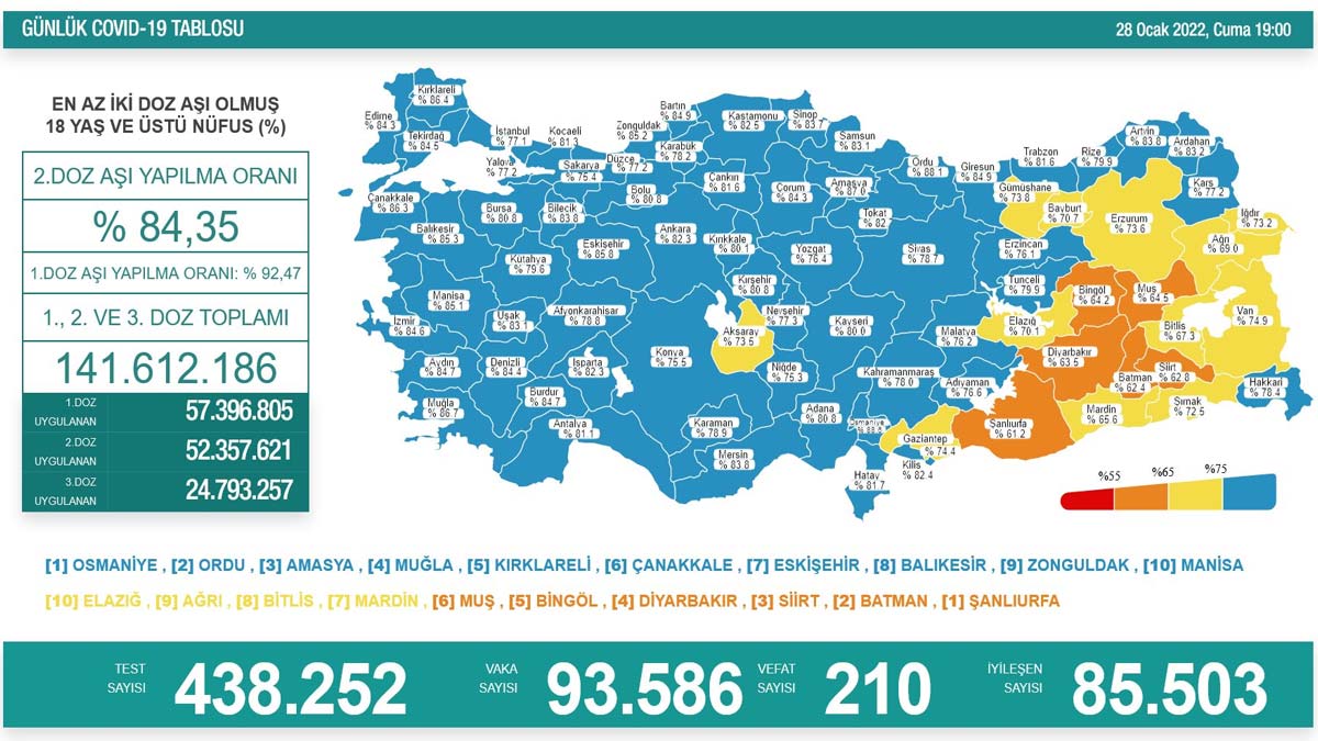 En az 2 doz aşı olan kişi sayısının en yüksek olduğu iller; Osmaniye, Ordu, Amasya, Muğla, Kırklareli, Çanakkale, Eskişehir, Balıkesir, Zonguldak ve Manisa olurken, 2 doz aşı yapılan kişi sayısının en düşük olduğu iller ise Şanlıurfa, Batman, Siirt, Diyarbakır, Bingöl, Muş, Mardin, Bitlis, Ağrı ve Elazığ oldu.