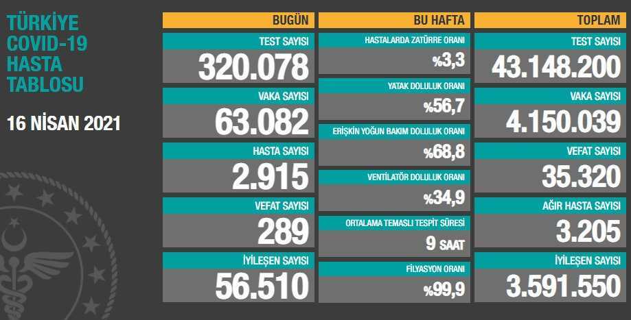 Sağlık Bakanlığı’nın açıkladığı 16 Nisan 2021 tarihli güncel koronavirüs verileri açıklandı. Bugün koronavirüsten 289 kişi hayatını kaybetti.