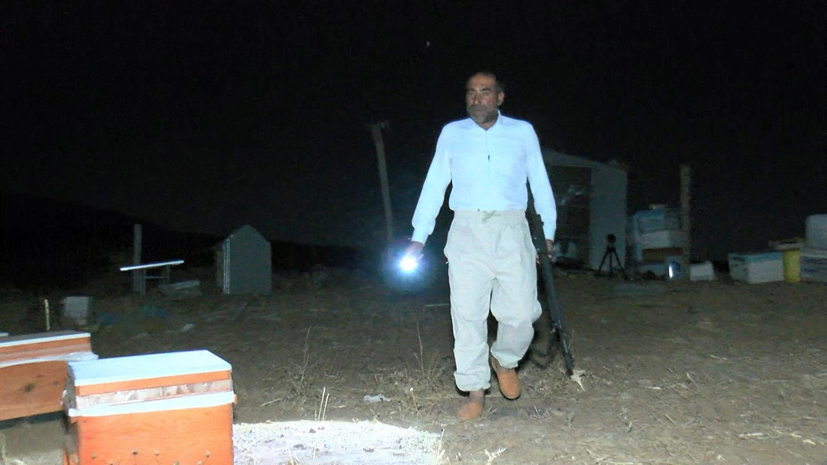 Bingöl’ün Kartal köyünde arıcılık yapan ve 200 kovanı olan Yusuf Çağan (45), kovanlara ayı saldırısına karşı geceleri av tüfeğiyle nöbet tutuyor.