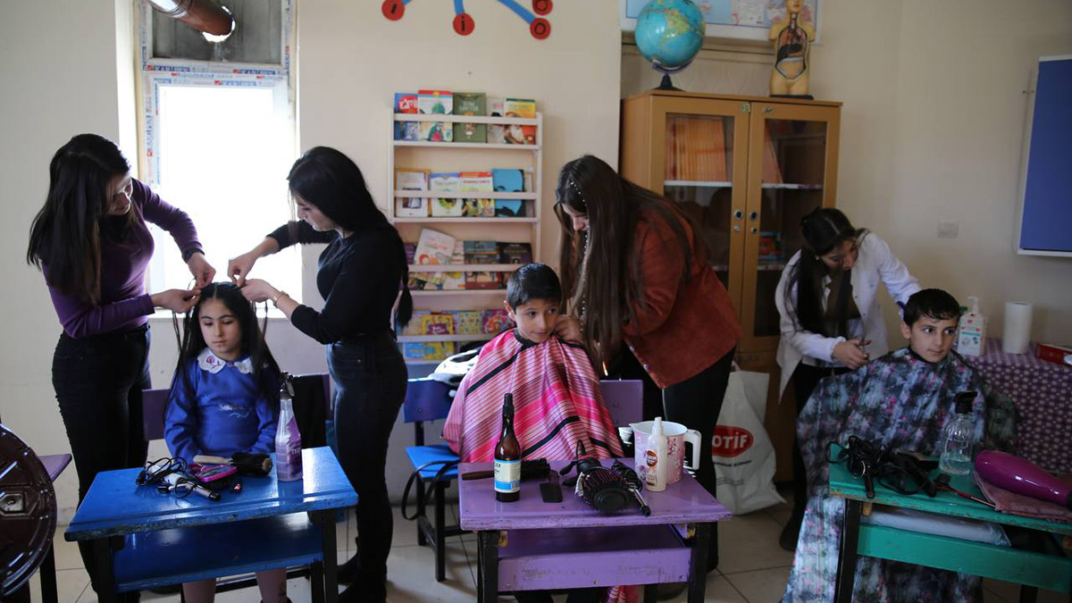 Hakkari’nin Yüksekova ilçesinde, Halk Eğitim Merkezi Müdürlüğü bünyesinde açılan kuaförlük ve güzellik kurslarında usta öğreticilik yapan 7 kadın kuaför, köy okulundaki çocukları tıraş etti, kız öğrencilerini saç bakımlarını yaptı.