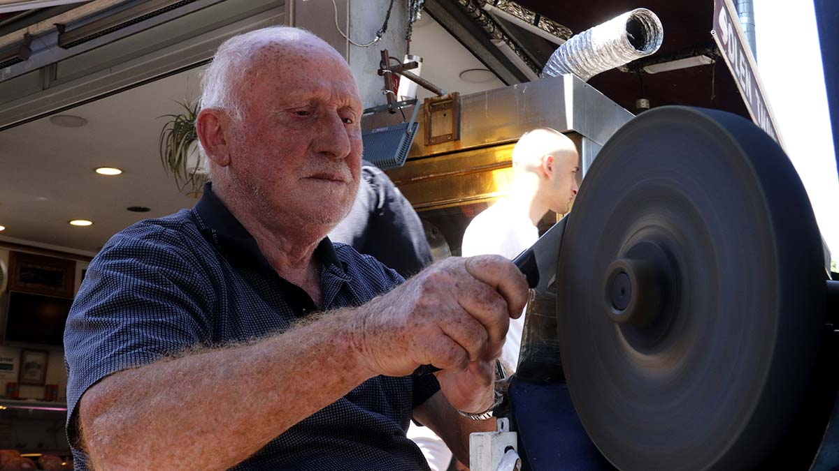 Bıçak bileyleme ustası Aydın Işık, 65 yıldır bu mesleği yaptığını belirterek “İtinalı şekilde bıçakları biliyoruz. Bu işlem 6 kademede yapılır. Kalın ve ince taştan geçirdikten sonra, keçe üzerinde ve yağ taşıyla bileriz. Masa üzerinde de işlem yaptıktan sonra keskinliğini kontrol ederiz. Böylece bıçak hazır olur. Piyasada sadece 2 adımla yapılıyor, bu olmaz. Hayvanlar zarar görmesin. Bayram öncesi ortalama günde 500 bıçak biliyoruz” şeklinde konuştu.