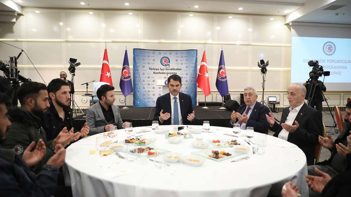 Çevre, Şehircilik ve İklim Değişikliği Bakanı Murat Kurum, Türk- İş temsilcileri ve sokak atık toplayıcıları ile iftarda bir araya geldi. Ankara’da bir otelde düzenlenen iftar programına Bakan Murat Kurum’un yanı sıra, Türk- İş Başkanı Ergün Atalay, Sokak Atık Toplayıcıları Derneği (SATDER) Başkanı Recep Karaman ve çok sayıda kişi katıldı.