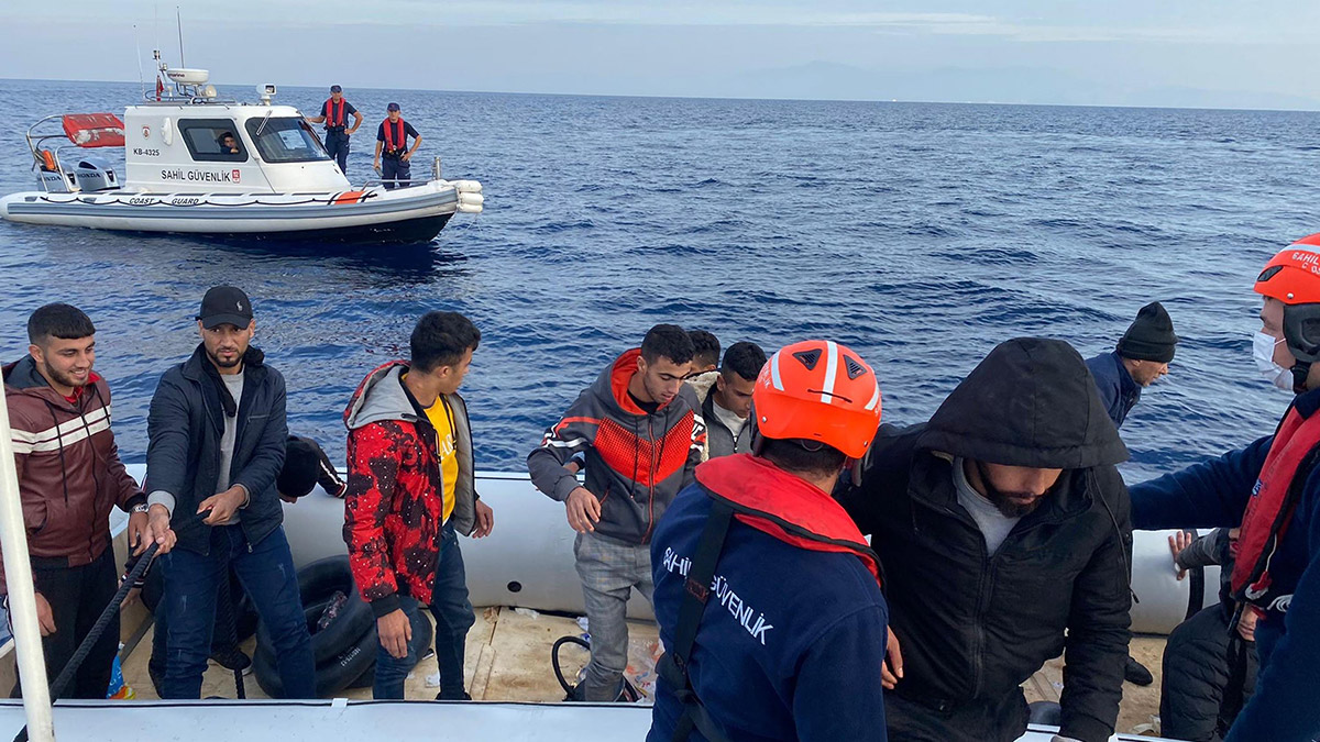 Aydın’ın Kuşadası ilçesi açıklarında, Yunanistan unsurlarınca Türk karasularına geri itilen lastik bot içerisindeki 75 göçmen kurtarıldı.