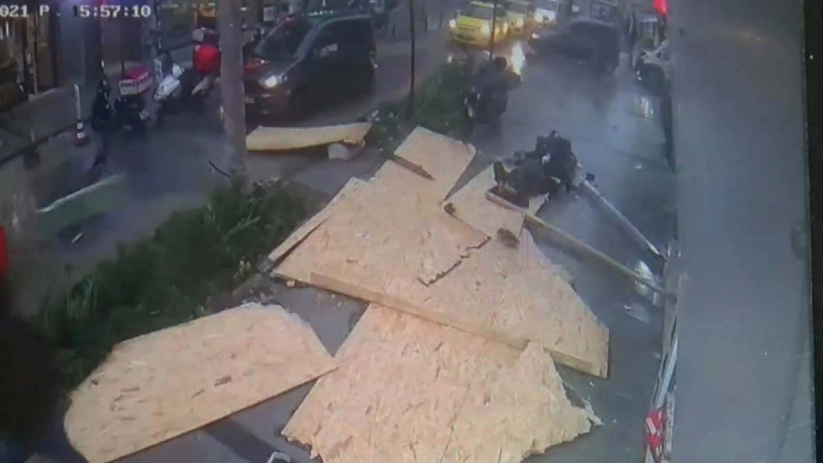 Anne ile oğlunun, yolun karşısındaki binanın çatısından kopan parçaların altında kaldığı anlar çevredeki bir iş yerinin güvenlik kamerasına yansıdı. Görüntülerde, anne ile oğlunun el ele yürüdüğü sırada, çatı parçalarının bir anda üzerlerine düştüğü görülüyor. O sırada bir kişinin de kıl payı kurtulduğu gözlenen görüntülerde, esnafın yaralıların yardımına koşması da kayıtlara yansıyor.