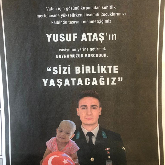 Lösemlil Çocuklar Sağlık ve Eğitim Vakfı (LÖSEV), şehit Yusuf Ataş’ın vasiyeti üzerine lösemili bir çocuğun eğitim masraflarının karışlanmasını için gazeteye ilan verdi.