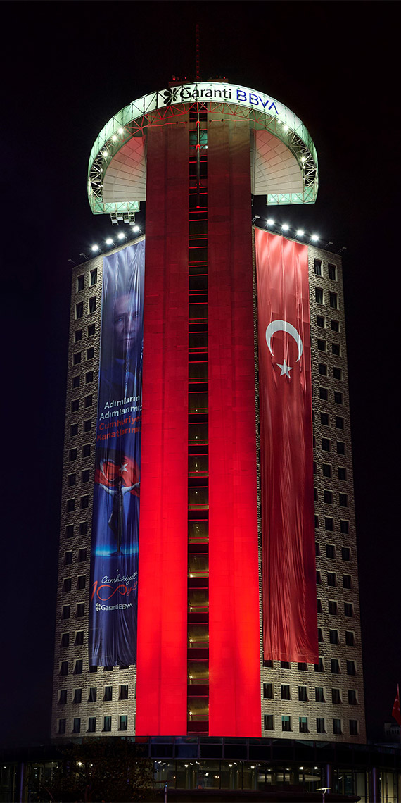 Garanti BBVA, Cumhuriyetin 100’üncü yaşını, gerçekleştirdiği bir dizi etkinlikle kutladı. Bu kutlamaların bir parçası olarak İstanbul Genel Müdürlük binası da Türk bayrağının renkleriyle aydınlatıldı.