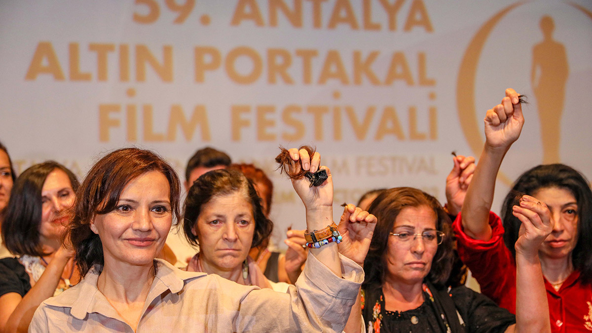 ‘Narperi’nin Bileziği’ belgeseli film ekibi ve oyuncuları gösterim sonunda, İran’da saçı gözüktüğü gerekçesiyle polis tarafından gözaltına alındıktan sonra hayatını kaybeden Mahsa Amini için sahnede saçlarını kesti.
