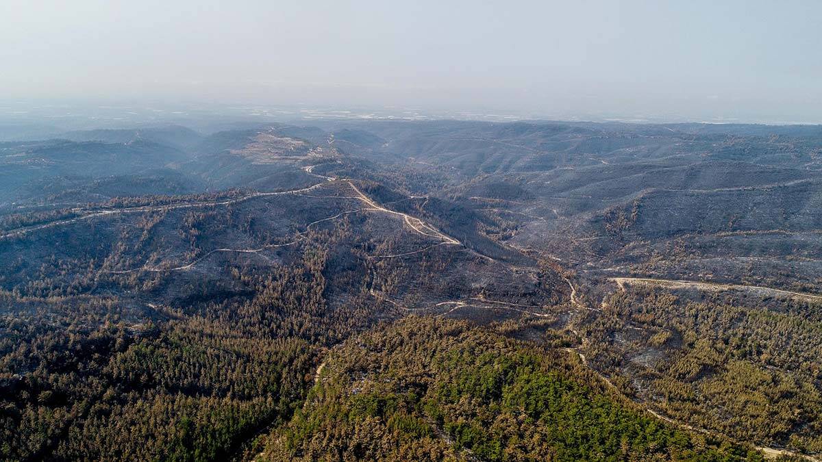 Manavgat’ta 10’uncu günde orman yangını devam ediyor. Ekiplerin sahada zorlu mücadele ile söndürüp soğuttuğu alanlar ise geride yaşam belirtisi olmayan simsiyah bir görüntü bıraktı. Yanan ağaçların gövdeleri kömüre dönerken, zemin de simsiyah külle kaplandı. Havadan görüntülenen bu alanların çok geniş alana yayıldığı dikkati çekerken yangından daha az zarar gören yerlerin ise sarı renge büründüğü gözlendi. Yetkililer, yangında küle dönen orman alanı miktarının 100 bin hektarın üzerinde olduğunu belirtti.