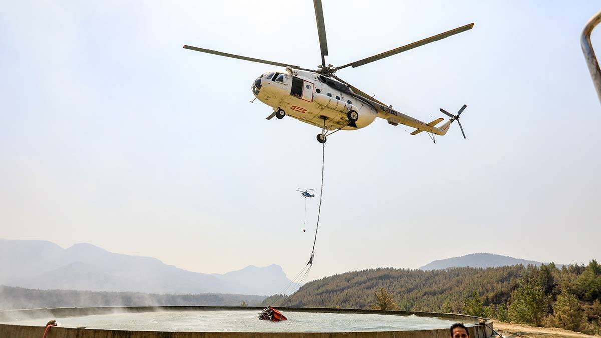 Manavgat’ta 9 gündür süren yangına havadan ve karadan müdahale sürüyor. Yangının söndürülmesinde büyük rol oynayan yangın söndürme helikopterleri ise alevlerin yükseldiği Kızıldağ bölgesine müdahale ediyor. Boyutlarına göre tek seferde 3 ile 9 ton arasında su bırakabilen helikopterler, suları ise bölgeye yakın su havuzundan alıyor. Havuza 3 dakikada 8 helikopter su almak için gelirken, bir helikopterin su aldığı sırada diğer helikopterler ise havada sıra bekliyor. Diğer yandan havuz, Türkiye’nin farklı noktalarından getirilen su tankerlerinin taşıdığı sularla dolduruluyor. Suyu havuza dolduran tankerlerin çalışanları ise helikopterlerin su almak için alçaldığı sırada oluşan şiddetli rüzgarda zor anlar yaşıyor.