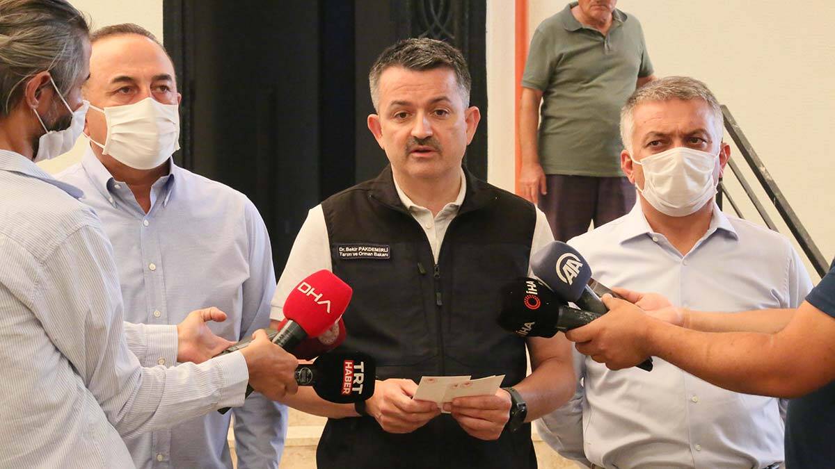 Helikopterle bölgede incelemede bulunan Tarım ve Orman Bakanı Bekir Pakdemirli, Dışişleri Bakanı Mevlüt Çavuşoğlu, Antalya Valisi Ersin Yazıcı ve AK Parti Antalya Milletvekili İbrahim Aydın ile birlikte Yangın Komuta Merkezi’nde son durumla ilgili bilgileri paylaştı.