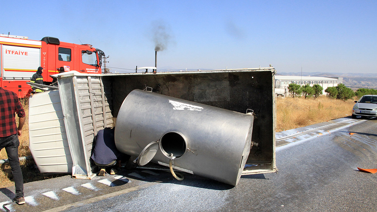 Manisa’da, lastiği patlayan süt kamyoneti devrildi. Araçta sıkışan şoför Yüksel Ülkü, itfaiye ekiplerince yaralı kurtarılarak, hastaneye kaldırıldı.