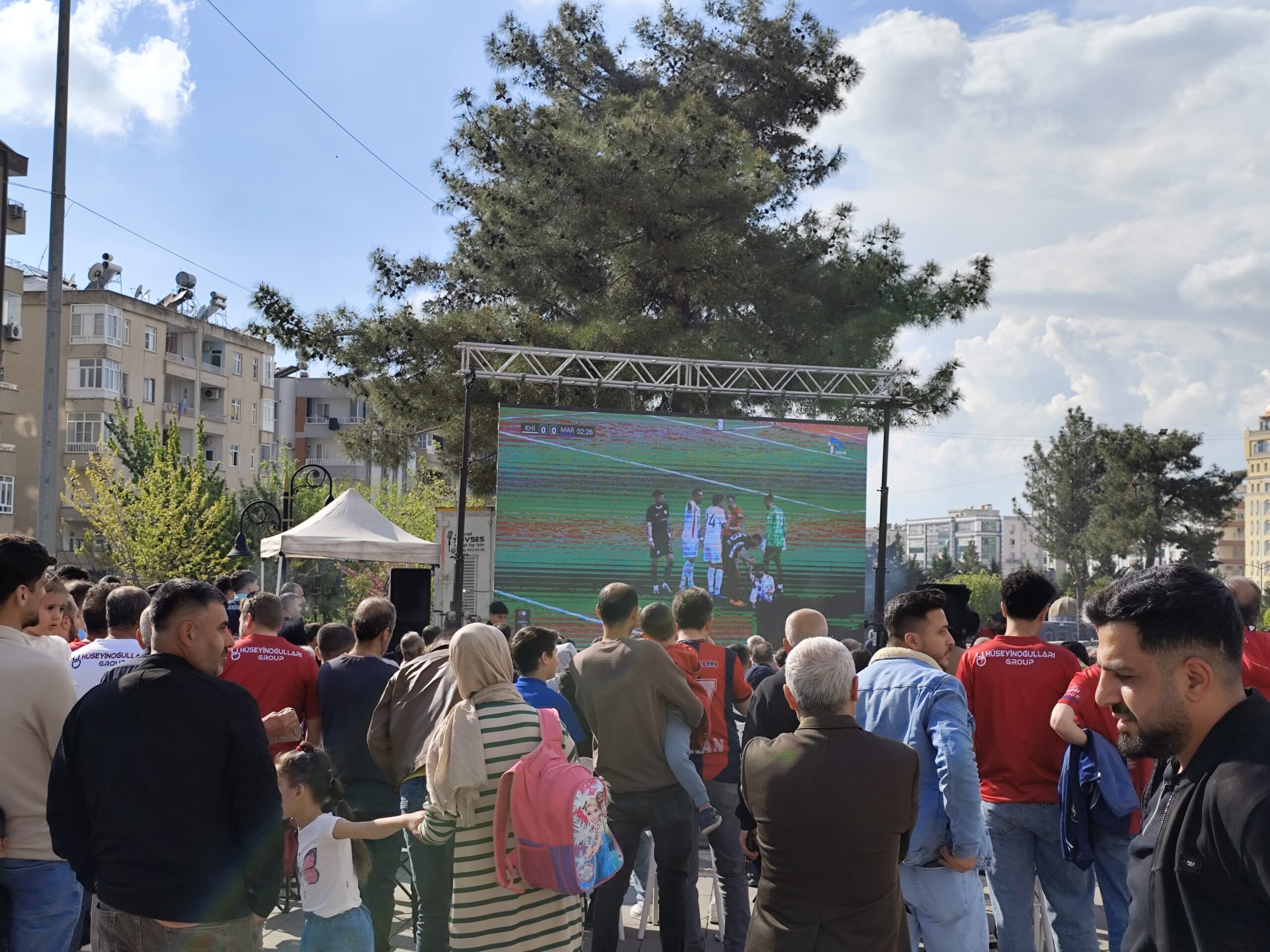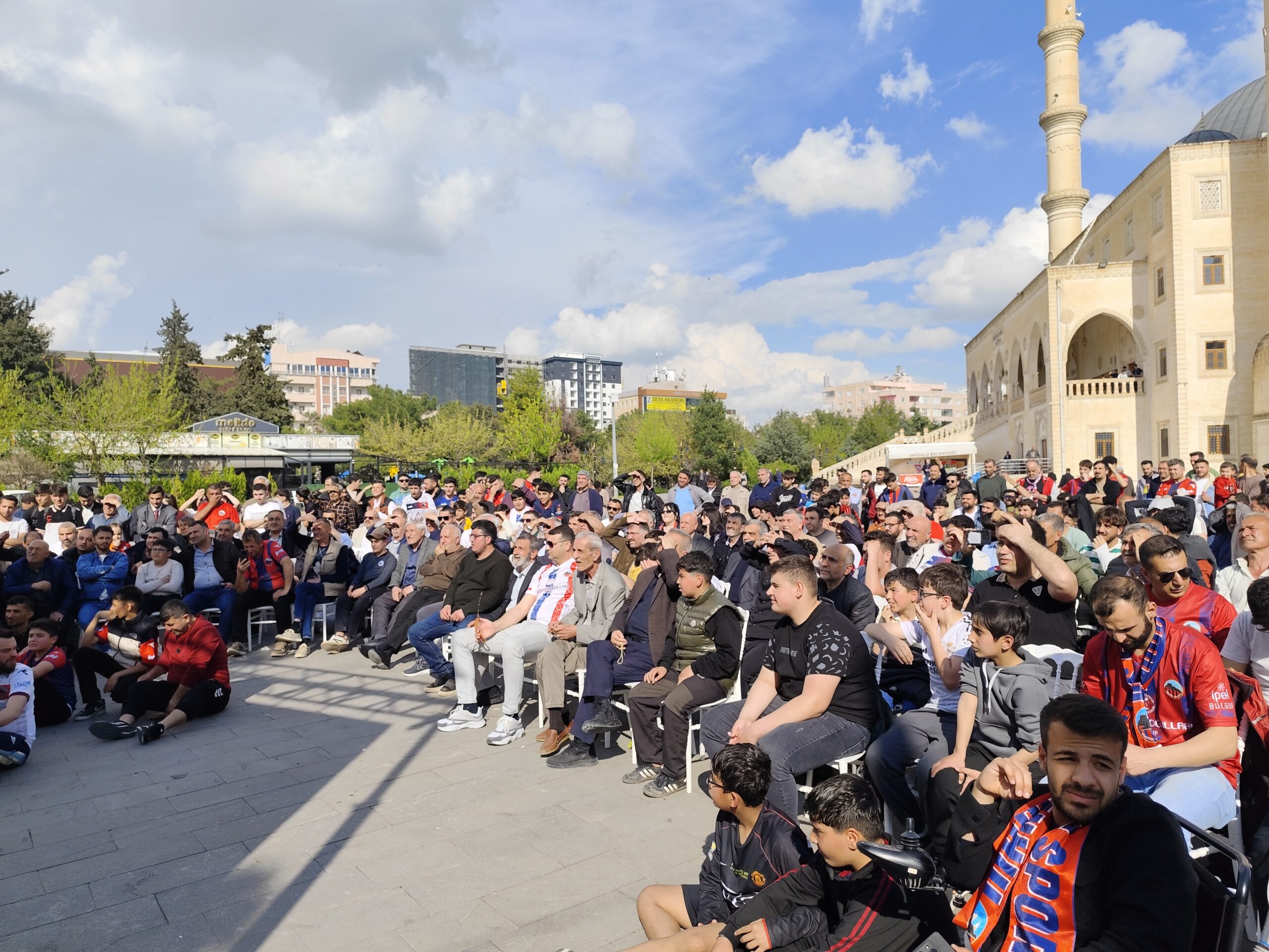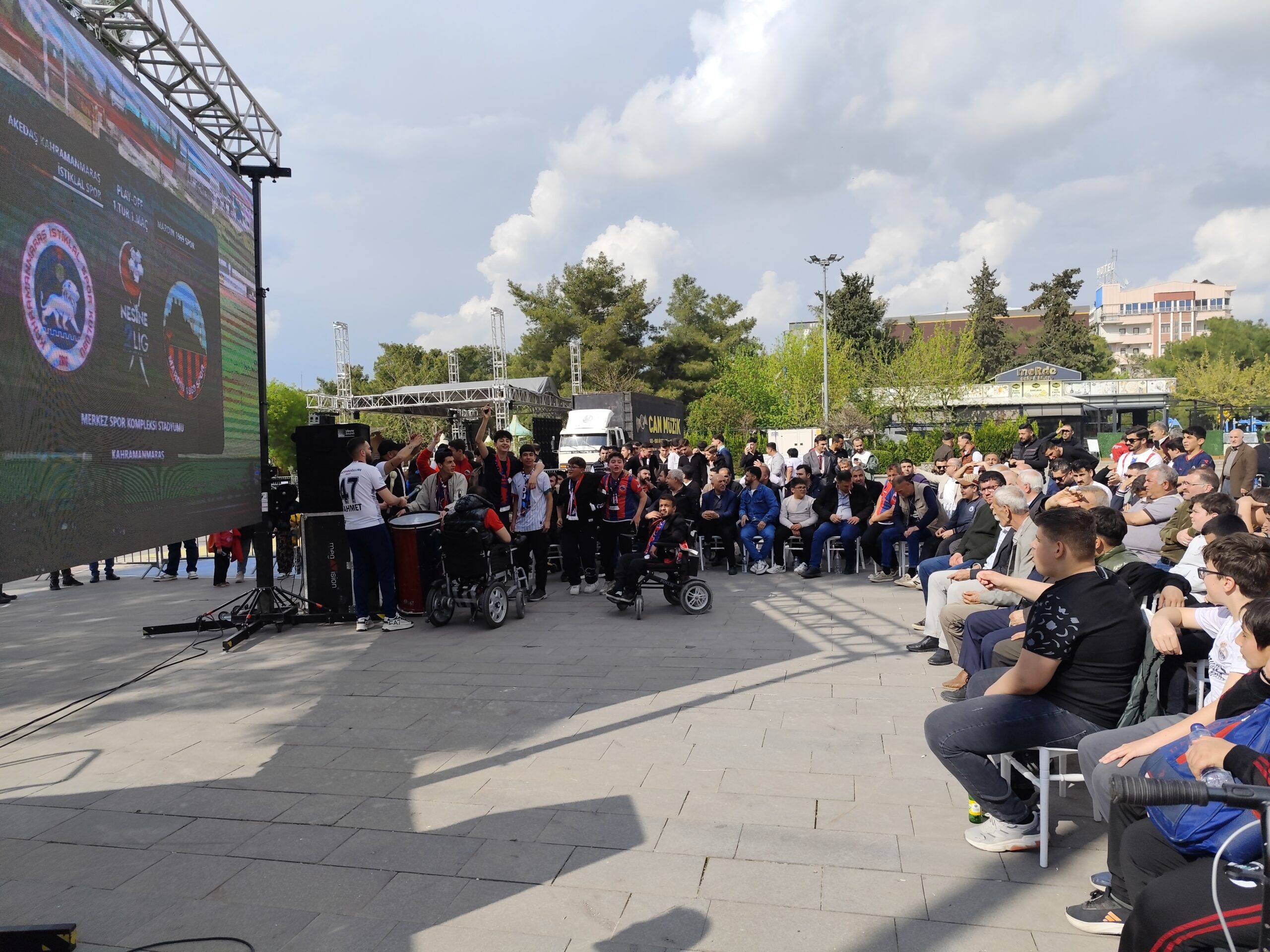 2’nci Lig Kırmızı Grup play-off 1’inci tur maçında Akedaş Kahramanmaraş İstiklal Spor’a konuk olan Mardin 1969 Spor taraftarı, deplasman yasağı nedeniyle maçı Artuklu 15 Temmuz Demokrasi ve Şehitler Parkı’nda kurulan dev ekranda izledi.