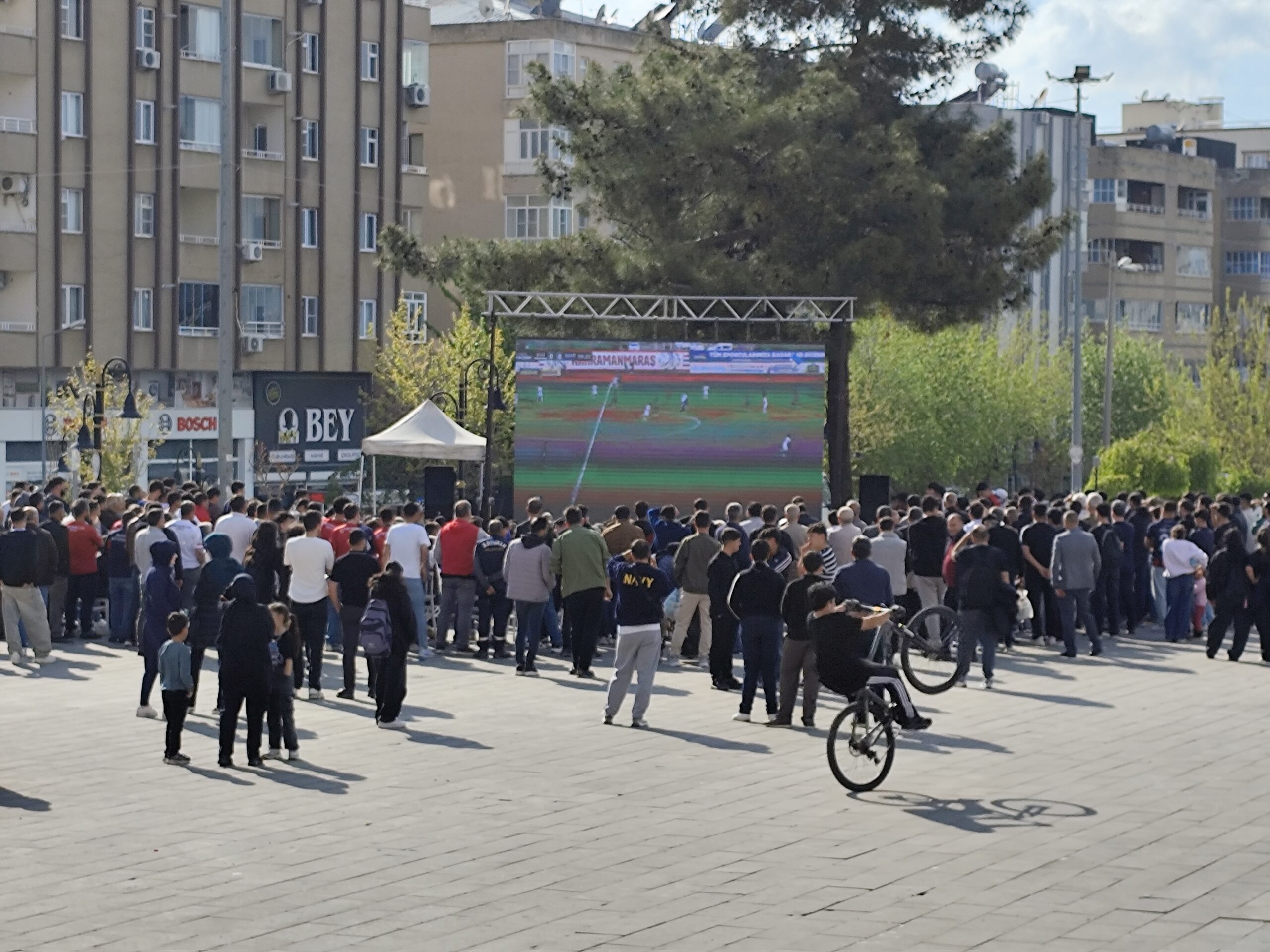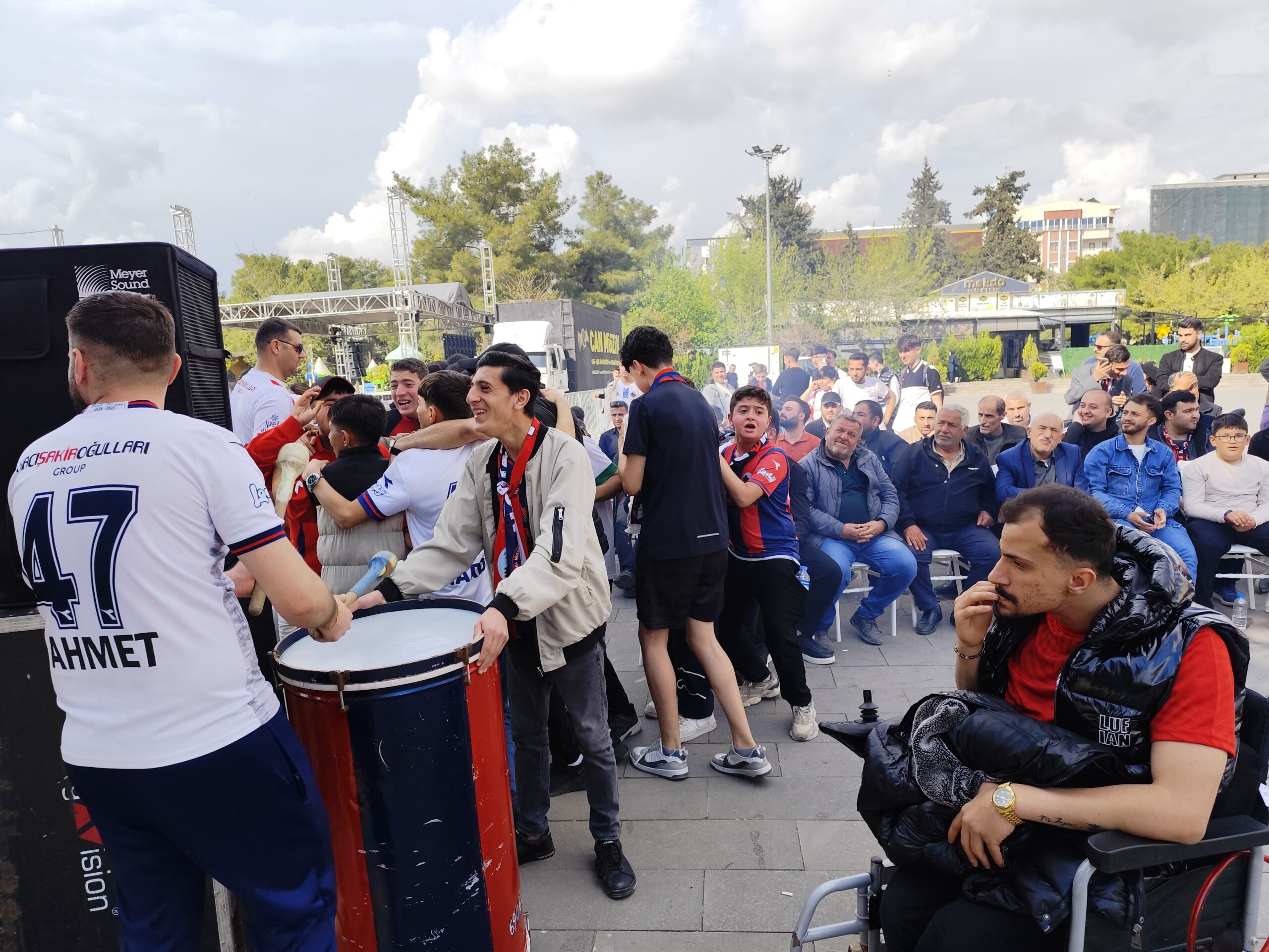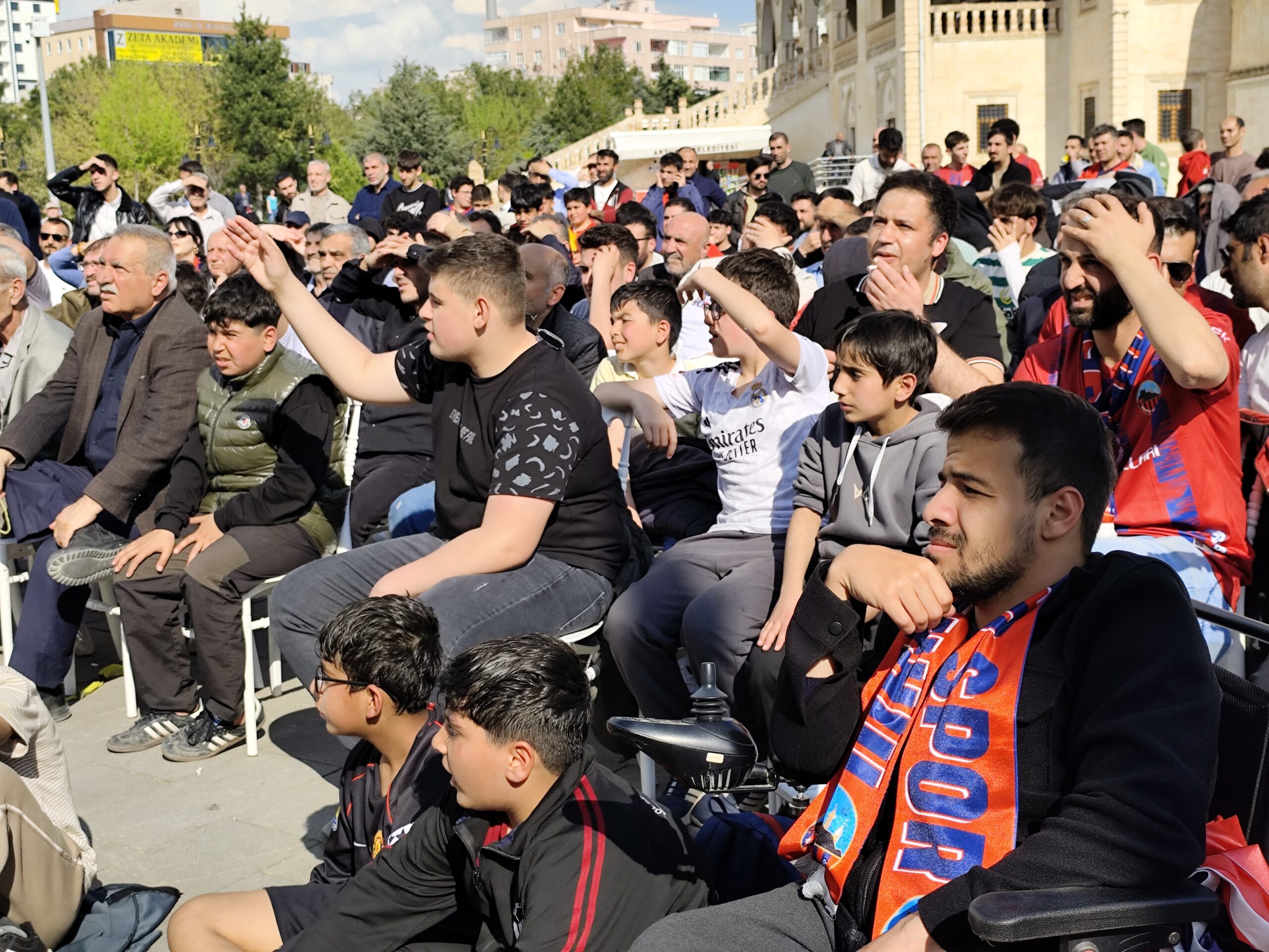 2’nci Lig Kırmızı Grup play-off 1’inci tur maçında Akedaş Kahramanmaraş İstiklal Spor’a konuk olan Mardin 1969 Spor taraftarı, deplasman yasağı nedeniyle maçı Artuklu 15 Temmuz Demokrasi ve Şehitler Parkı’nda kurulan dev ekranda izledi.