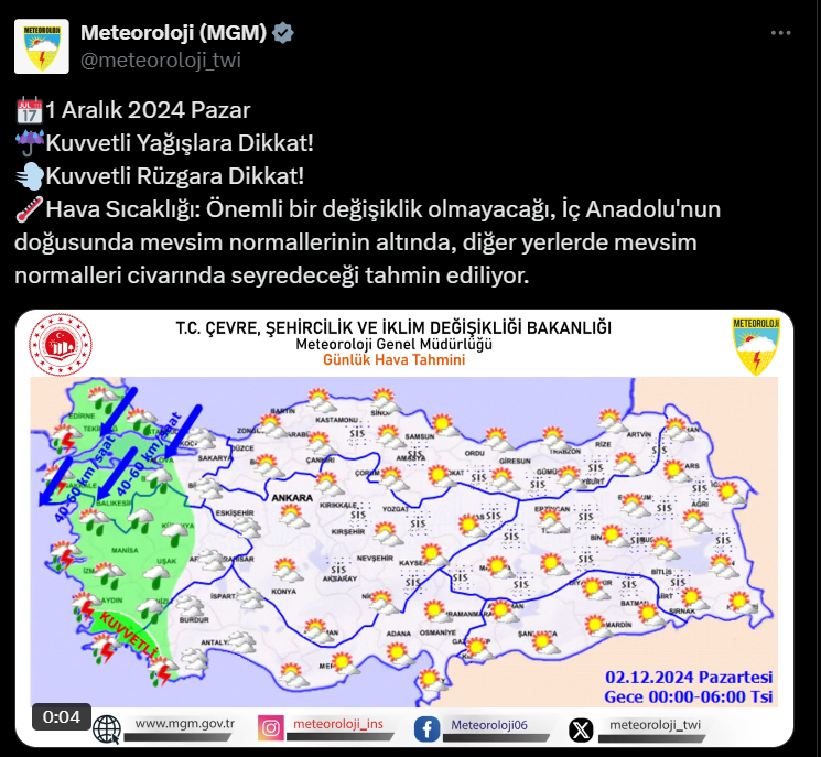 Meteoroloji Genel Müdürlüğü, 1 Aralık 2024 hava durumu raporunu yayımladı. Rapora göre Ege ve Çanakkale çevreleri ile Balıkesir’in batı ilçelerinde yerel kuvvetli sağanak yağış bekleniyor.