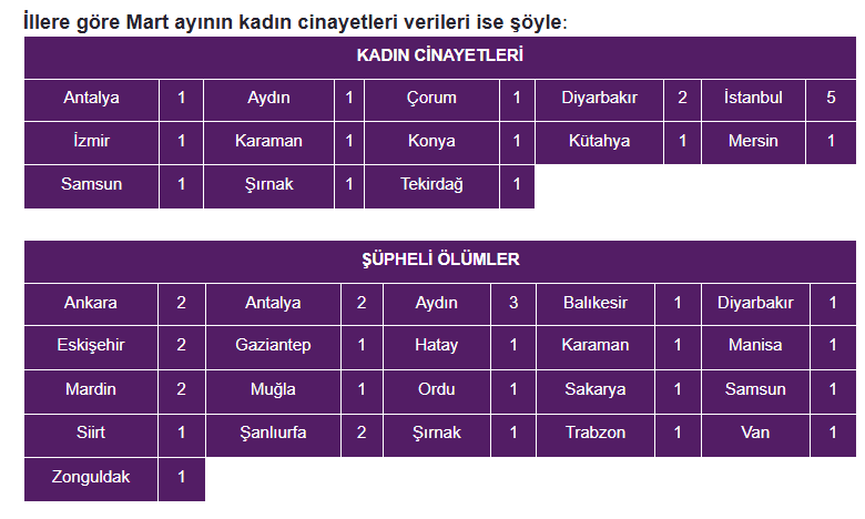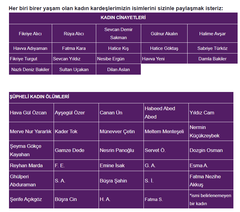 Türkiye’de kadın cinayetlerini durdurma mücadelemiz 15 yıldır devam ediyor. Platform olarak, ihtiyacı tespit ettiğimiz 2010 yılından itibaren kadın cinayeti verilerini kamuoyuna açıklıyoruz. Bakanlıklar ise sistematik şekilde maalesef kadın cinayeti verilerini tutmayıp paylaşmıyor. Kadın cinayeti ve şüpheli kadın ölümleri gerçekliğini açıklamakla birlikte, kadın cinayetlerini durdurmak için somut çözüm önerilerinin hayata geçirilmesi de devletin görevidir. Bu görevin yerine getirilmesi için de ilgili tüm bakanlıkların, tüm mekanizmaların harekete geçirilmesi için mücadeleye devam edeceğiz.