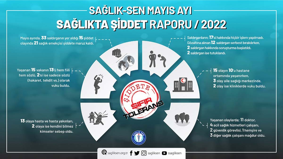 Sağlık-Sen’in ‘Sağlıkta Şiddet Raporu’nda mayıs ayında sağlık çalışanlarına yönelik 15 şiddet olayının meydana geldiği, 21 sağlık çalışanın mağdur olduğu belirtildi.