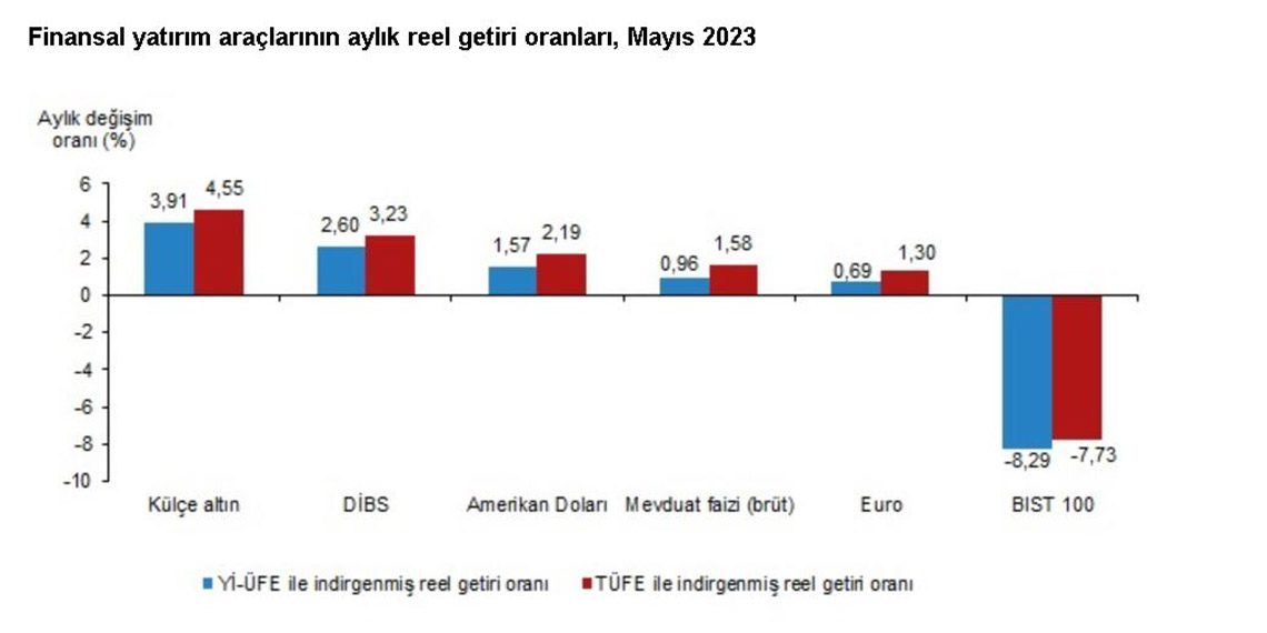 Finansal yatırım araçları yıllık olarak değerlendirildiğinde ise BIST 100 endeksi Yİ-ÜFE ile yüzde 33,84, TÜFE ile yüzde 34,96 oranlarında en yüksek reel getiriyi sağladı. Külçe altın yüzde 2,41 oranında yatırımcısına reel getiri sağlarken; DİBS yüzde 1,53, euro yüzde 8,37, dolar yüzde 10,73 ve mevduat faizi (brüt) yüzde 17,58 oranlarında yatırımcısına kaybettirdi. TÜFE ile indirgendiğinde külçe altın yüzde 3,27 oranında yatırımcısına reel getiri sağlarken; DİBS yüzde 0,70, euro yüzde 7,60, dolar yüzde 9,99 ve mevduat faizi (brüt) yüzde 16,89 oranlarında yatırımcısına kaybettirdi.