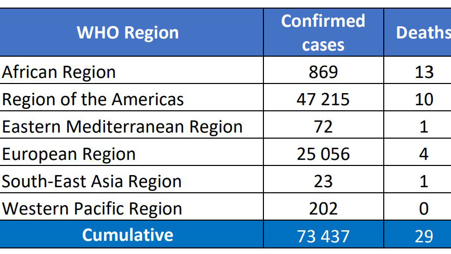 DSÖ, açıklamasında vaka sayılarında 5 Ekim’e oranla yüzde 6.6 oranında artış yaşandığını ve 4 bin 537 yeni vakanın tespit edildiğini belitti. Dünya genelinde bugüne kadar 109 ülkeden toplamda 73 bin 437 vaka bildirildiğini ve 29 kişinin virüse bağlı hastalıktan dolayı yaşamını yitirdiği vurgulandı.