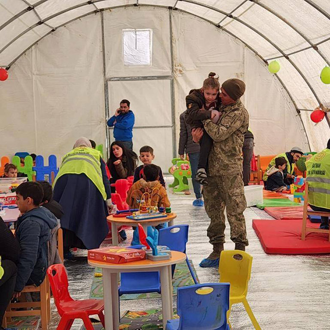 Kahramanmaraş merkezli depremlerin ardından afet bölgesinde normalleşme çalışmalarına devam edildi. Gaziantep’te bulunan KKTC’de konuşlu 14’üncü Zırhlı Tugay Komutanlığı’nca valilik koordinesinde anaokulu olarak kullanılmak üzere çadır kuruldu. Mehmetçik, süsledikleri ana okulunda depremzede çocuklarla oyunlar oynayıp resim çizdi.