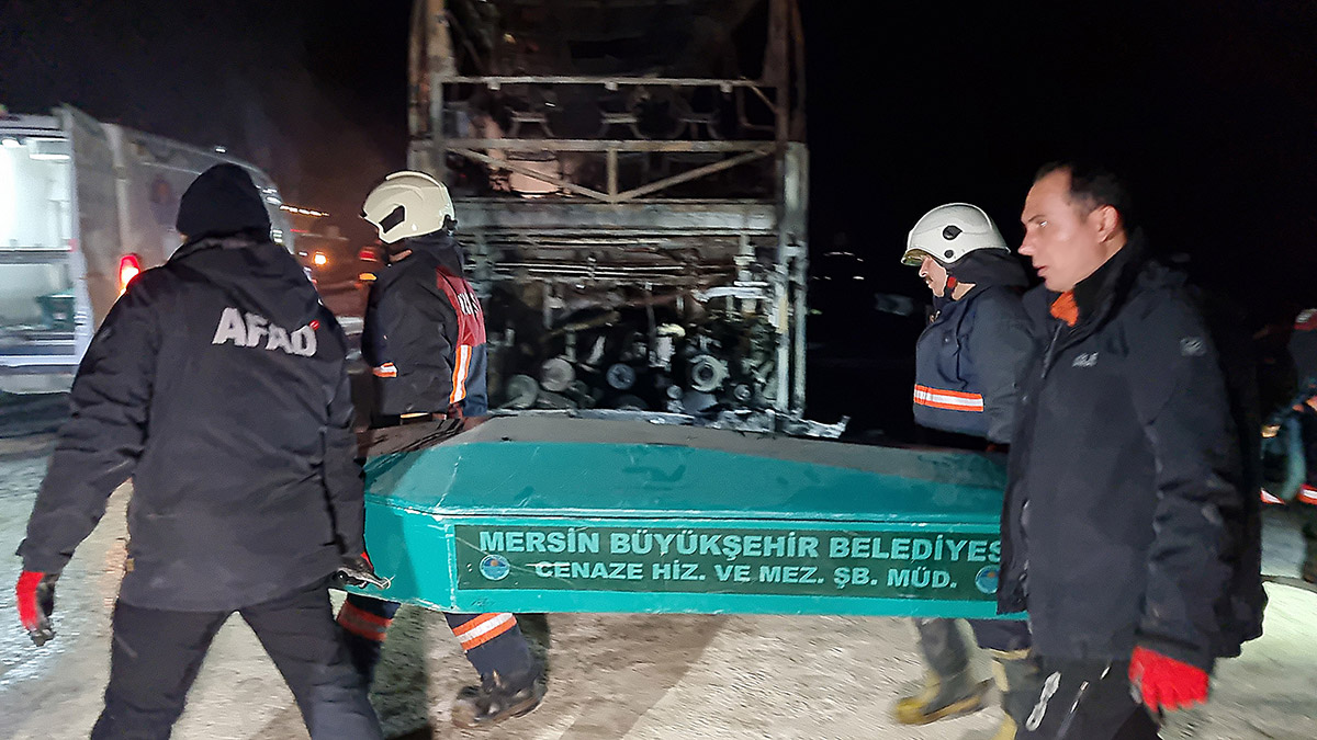 Tarsus Cumhuriyet Başsavcılığı, kazaya ilişkin açıklama yaptı. Açıklamada, “Gaziantep İl Jandarma Komutanlığı’nda görevli 2 astsubay, 9 uzman erbaş refakatinde 27 Fas uyruklu göçmeni Kırklareli GGM’ye götürmek üzere çıkarılan devriye 17.01.2023 günü saat 01.30 sıralarında TEM Otoyolu Taşobası mevki Adana-Ankara istikametinde seyir halindeyken sevkte görevli otobüsün demir taşıyan TIR’a arkasından çarpması sonucu otobüsün yanması ile ölümlü ve yaralanmalı trafik kazası meydana gelmiştir.