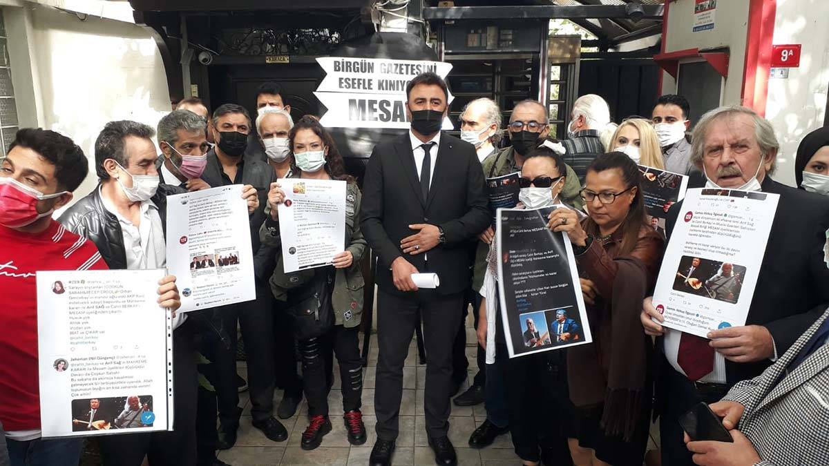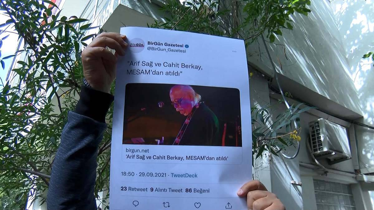 Türkiye Musiki Eseri Sahipleri Meslek Birliği ( MESAM) üyesi bir grup müzisyen Birgün Gazetesi binası önünde protesto gösterisi düzenledi. Yaptıkları basın açıklamasıyla ‘Arif Sağ ve Cahit Berkay’ın MESAM üyeliğinden düşürüldü’ haberine tepki gösteren grup üyeleri bina önüne siyah çelenk bıraktı.