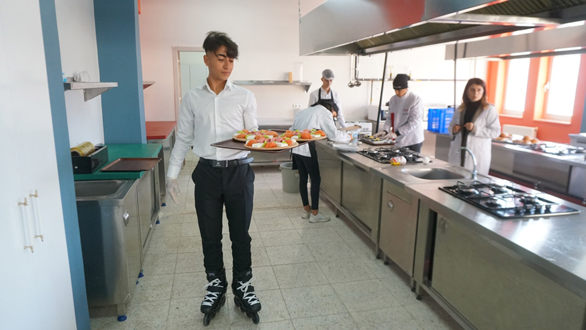 Siirt Abdülhamid Han Mesleki ve Teknik Anadolu Lisesi’nde 120 öğrenci, mayıs ayında turizm kentlerinde yapacakları staj öncesi ‘patenli garson’ hizmetini uygulamalı olarak alıyor.