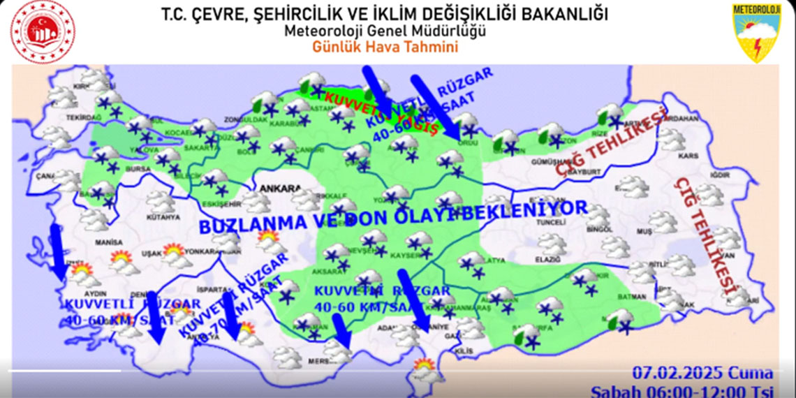 “Ülke genelinde hava sıcaklığında önemli bir değişiklik olmayacağı, ülkemiz genelinde mevsim normallerinin altında seyredeceği tahmin ediliyor. Doğu Karadeniz’in iç kesimlerinin yüksekleri ile Doğu Anadolu’nun doğusunun dik ve eğimli yamaçlarında çığ tehlikesi ile yurdun iç ve doğu kesimlerinde yer yer kuvvetli olmak üzere buzlanma ve don olayı beklendiğinden meydana gelebilecek olumsuzluklara karşı dikkat! Rüzgarın, Marmara, Kıyı Ege, Akdeniz, İç Anadolu’nun güneyi ile Orta Karadeniz kıyılarında kuzey yönlerden kuvvetli ve kısa süreli fırtına (40-70 km/sa) şeklinde esmesi beklendiğinden yaşanabilecek olumsuzluklara karşı dikkatli ve tedbirli olunması gerekmektedir” denildi.