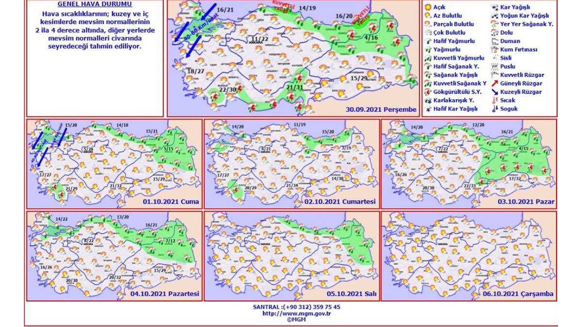 Meteoroloji Genel Müdürlüğü’nce ayrıca, 30 Eylül-6 Ekim haftalık hava durumu raporunda ise hava sıcaklıklarının kuzey ve iç kesimlerde mevsim normallerinin 2 ila 4 derece altında, diğer yerlerde mevsim normalleri civarında seyredeceğinin tahmin edildiği belirtildi.