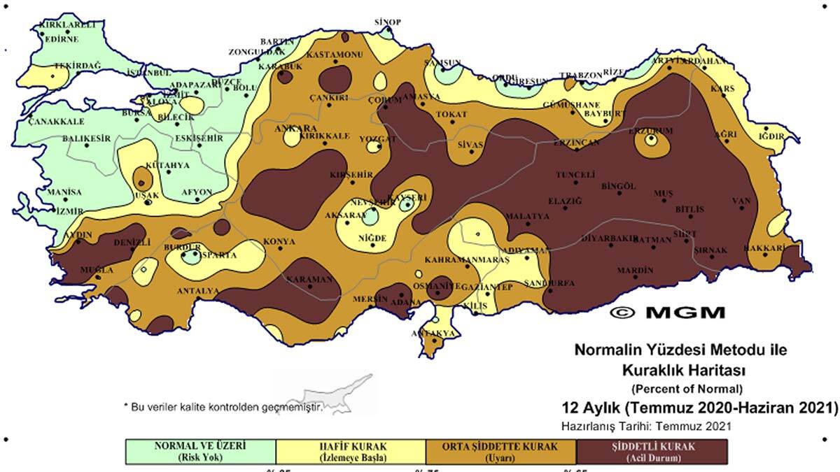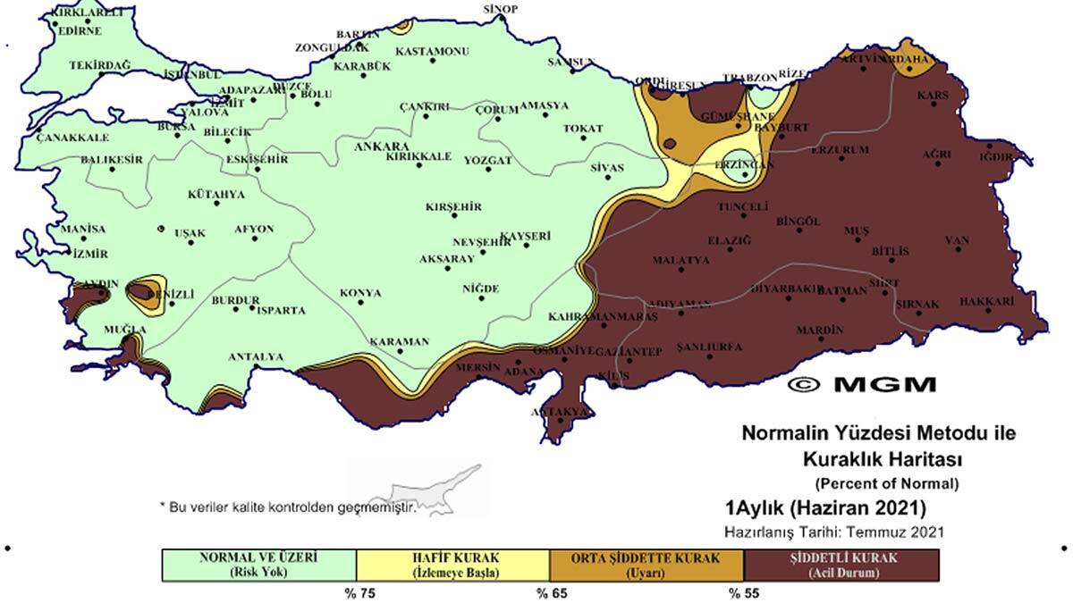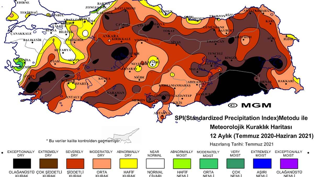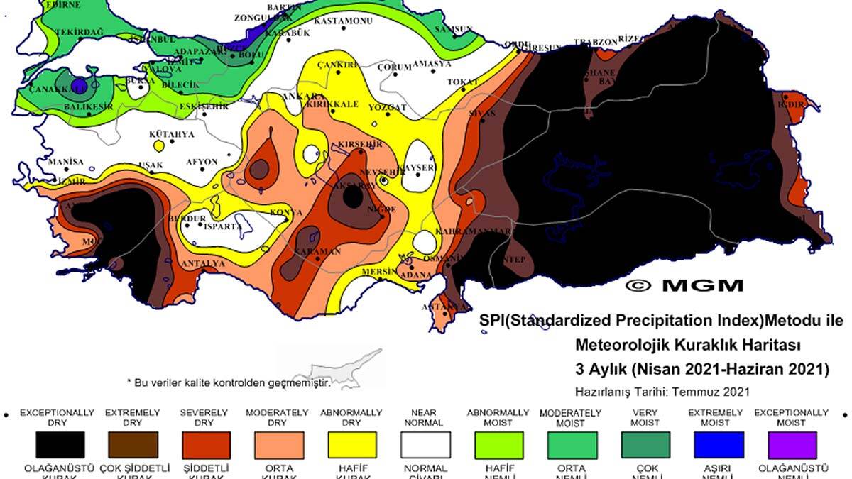 İki farklı metoda göre ölçümler yapılarak hazırlanan 2021 Haziran Ayı Meteorolojik Kuraklık Durumu haritalarında SPI metodu sonuçlarına göre Doğu Karadeniz, Doğu ve Güneydoğu Anadolu bölgeleri olmak üzere ülkenin doğusu, güney Ege ve Aksaray ‘olağanüstü kurak’ gösterildi. En son geçen Mayıs’ta yayımlanan haritalara göre, ülke genelindeki ‘olağanüstü kurak’ bölgelerin ciddi düzeyde arttığı gözlendi.