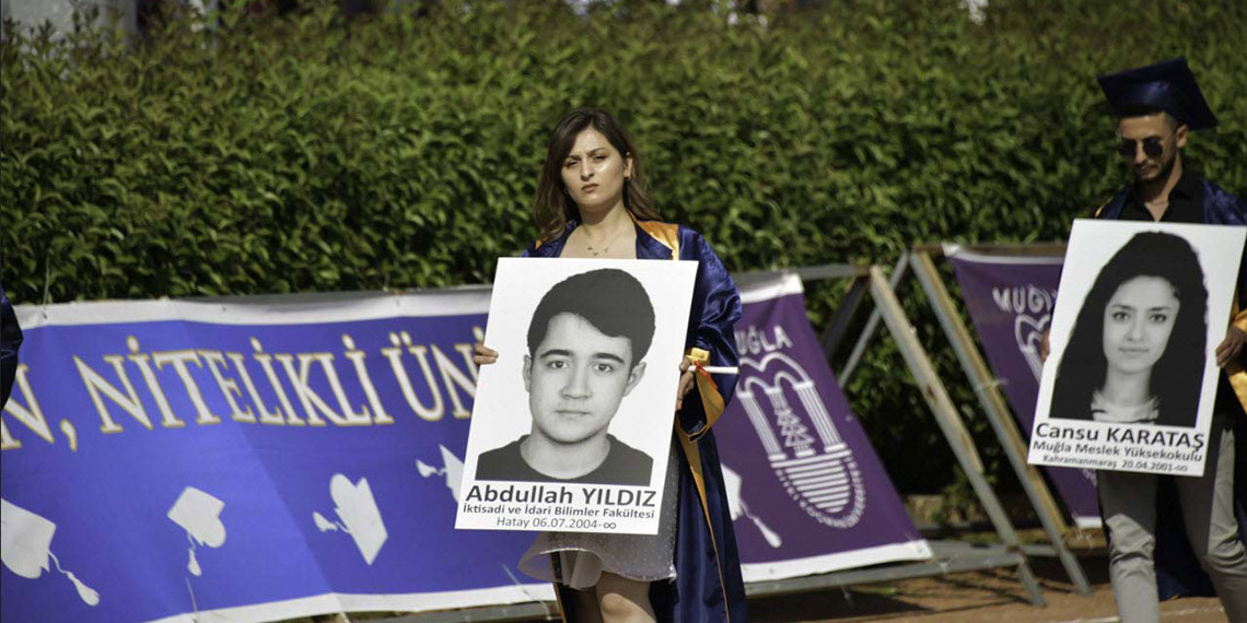 Muğla Sıtkı Koçman Üniversitesi’nin (MSKÜ) öğrencileri mezuniyet töreninde depremde ölen arkadaşlarının fotoğraflarını taşıdı.