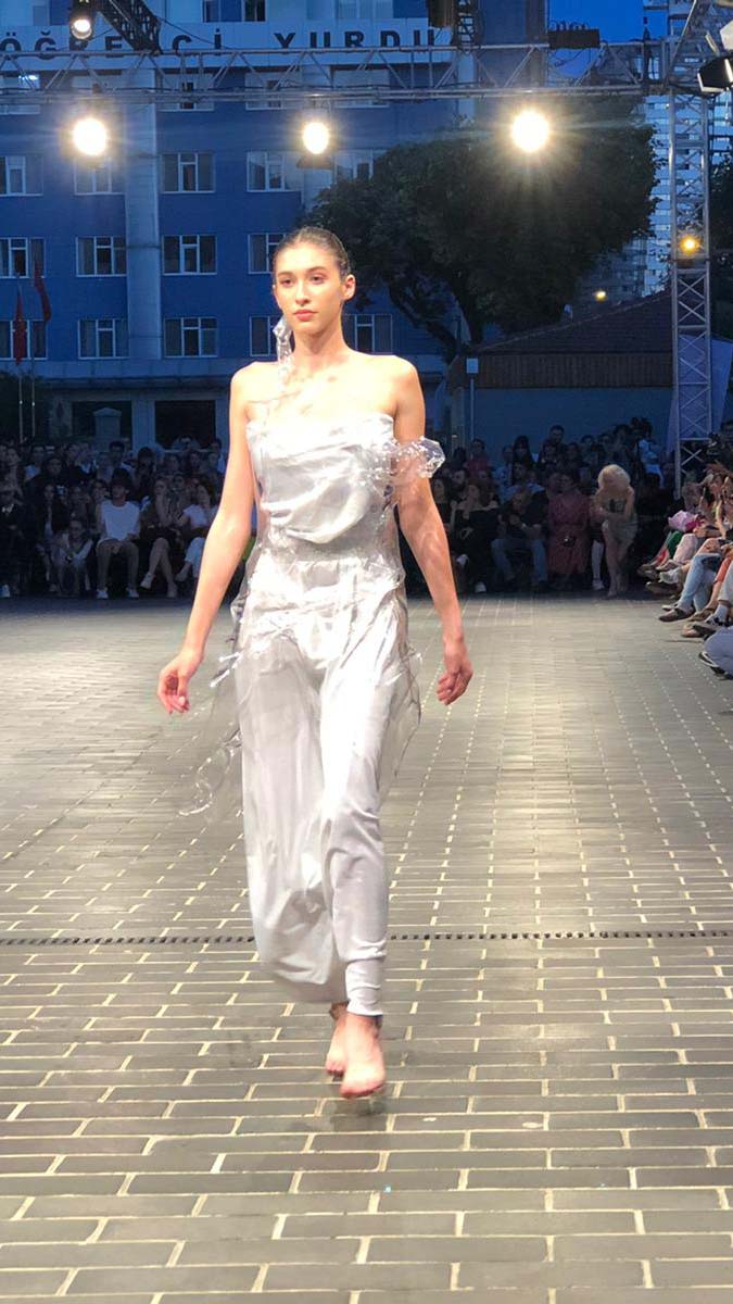 Çünkü kısıtlı malzeme ile bir tasarım üretmek gerçekten insanı zorlayan bir şey ama biz burada tasarımların daha farklı bir boyuta geldiğini gördük. Bu bizim için çok önemliydi. Bunlar evde buldukları herhangi bir çarşaf parçası oldu. Perdelerini söküp kesenler oldu. Bunlarla bambaşka tasarımlara dönüştü. Çok keyifli işler çıktı. Onları bir araya getirerek bir defile düzenledik” dedi.