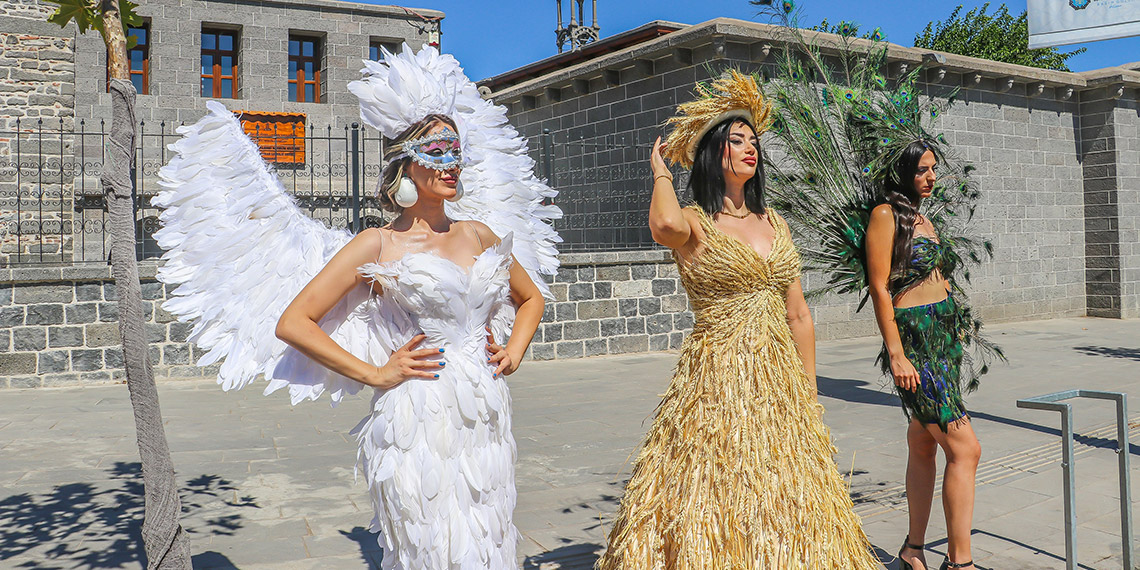 Diyarbakırlı modacı Mehmet Kaymak, ekip arkadaşlarıyla Şanlıurfa biberi, buğday başağı, bamya, tavus kuşu ve beyaz kartal tüylerinden gelinlik tasarladı. Kaymak, gelinlikleri Sur ilçesi Yenikapı Caddesi’nde düzenlediği sokak defilesiyle tanıttı. Özellikle Şanlıurfa biberi ve buğday başağı gelinlikle başında Diyarbakır karpuzu taşıyan mankenin giydiği tasarımlar dikkat çekerken, defileyi izleyenler, fotoğraf çekti.