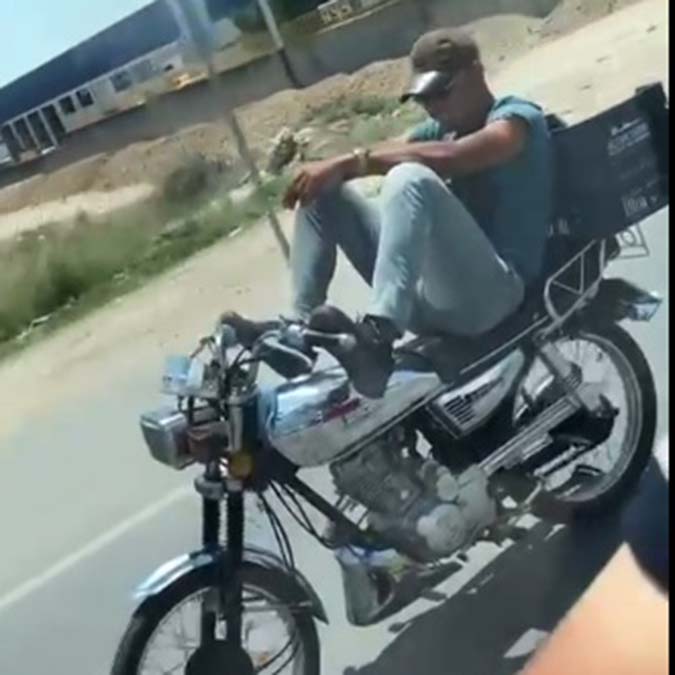 Adana’nın Seyhan ilçesi D-400 kara yolunda motosiklet sürücüsünün gidonu ayakları ile kullanıp, seyahat etmesi dikkat çekti. Akan trafikte tehlikeye aldırış etmeyen sürücünün rahat tavırları, başka bir sürücünün cep telefonu kamerasına yansıdı. Görüntülerde, arkasındaki kasaya sırtını dayayıp, ayakları ile gidonu yönlendiren kişi bir süre sonradan gözden kayboldu.
