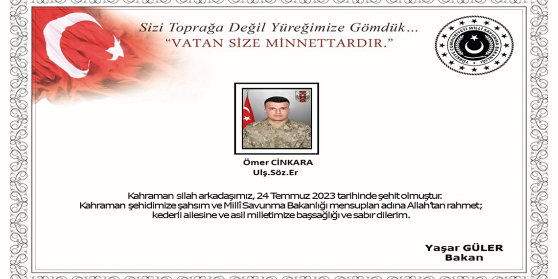 Bakanlıktan yapılan yazılı açıklamada, “Özalp, Van’da 24 Temmuz 2023 tarihinde silah kazası sonucu yaralanarak derhal hastaneye sevk edilen kahraman silah arkadaşımız Ulaştırma Sözleşmeli Er Ömer Cinkara yapılan tüm müdahalelere rağmen kurtarılamayarak şehit olmuştur. Bizleri derin bir acı ve üzüntüye boğan bu olayda hayatını kaybeden aziz şehidimize Allah’tan rahmet, kederli ailesine, Türk Silahlı Kuvvetleri ile asil milletimize başsağlığı ve sabır dileriz” denildi.