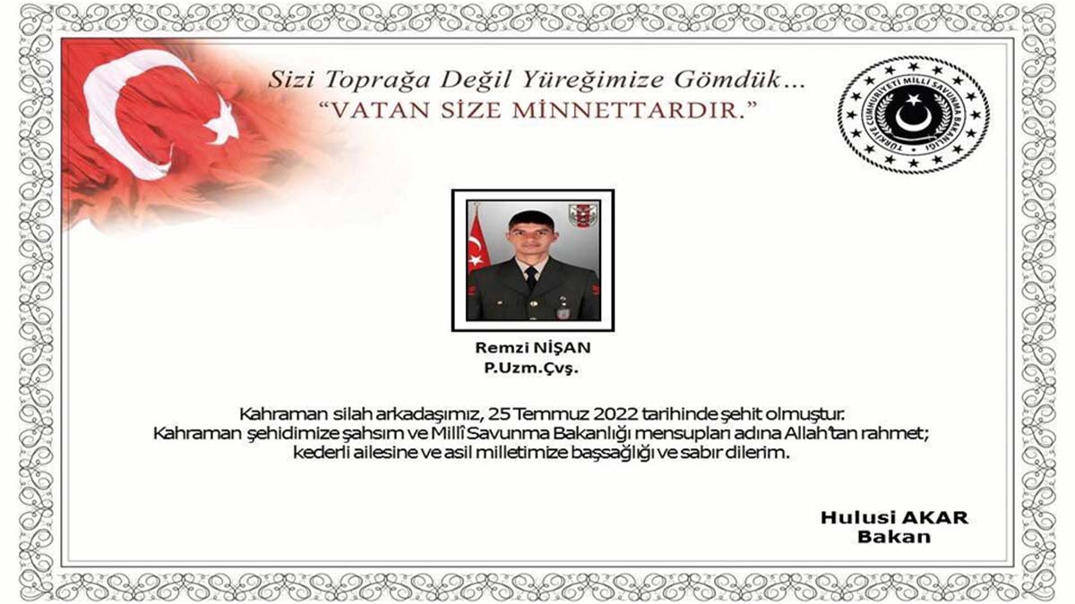 Bakanlıktan yapılan yazılı açıklamada, “25 Temmuz 2022 tarihinde, Pençe-Yıldırım Harekat bölgesinde bölücü terör örgütü mensuplarınca gerçekleştirilen saldırı sonucu Piyade Uzman Çavuş Remzi Nişan şehit olmuştur. Bizleri derin bir acı ve üzüntüye boğan bu olayda hayatını kaybeden aziz şehidimize Allah’tan rahmet, kederli ailesine, Türk Silahlı Kuvvetleri ile asil milletimize başsağlığı ve sabır dileriz” denildi.