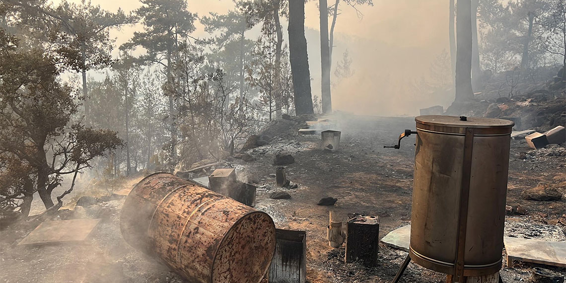 Menteşe ilçesi Sarnıç Mahallesi yakınlarındaki ormanda dün saat 13.00 sıralarında çıkan yangınına havadan ve karadan ekiplerin müdahalesi sürüyor. Alevlerin sıçradığı içi arı dolu 250 kovan da zarar gördü. Yakınlarına ait arı kovanlarının zarar görmesi nedeniyle büyük bir üzüntü yaşadığını dile getiren mahalle sakini İsmail Tolga, “Sağım yapıyorduk, dumanları görünce bölgeyi terk ettik. Yakınlarımın arı kovanları yandı çok üzgünüz” dedi. Öte yandan, yangında bir bağ evi ve çevresindeki zeytin ağaçları da zarar gördü.