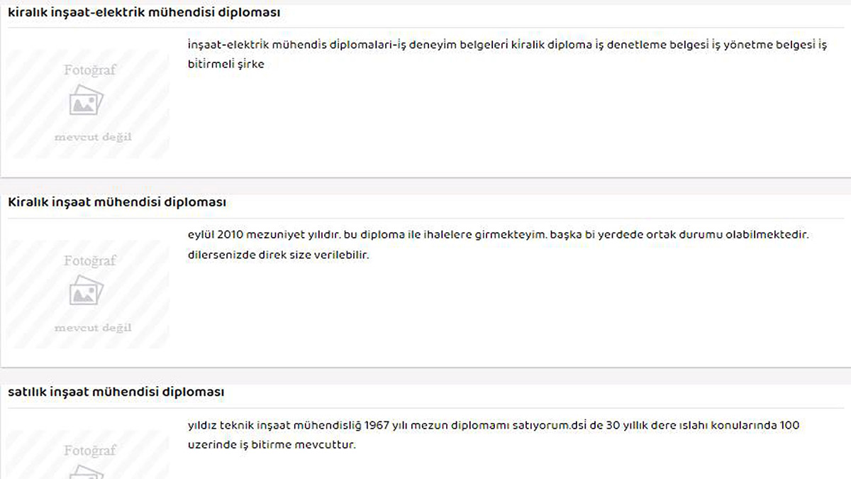Dijital platformda diplomasını satışa çıkardığını veya kiraya vermek istediğini belirten inşaat mühendislerinin yüzlerce ilanı görüldü. İlanlarda, ‘Yap-sat projeleri için şantiye şefi göstermek adına anlaşıldığı takdirde diplomamı kullandırabilirim’, ‘7 yıllık inşaat mühendisi diplomam şantiye şefliği, yapı denetim firmaları veya ihaleler için kiralıktır’, ‘Yıldız teknik inşaat mühendisliği 1967 yılı mezunu diplomamı satıyorum. DSİ’de 30 yıllık dere ıslahı konularında 100 üzerinde iş bitirme mevcuttur’ paylaşımları yer aldı.